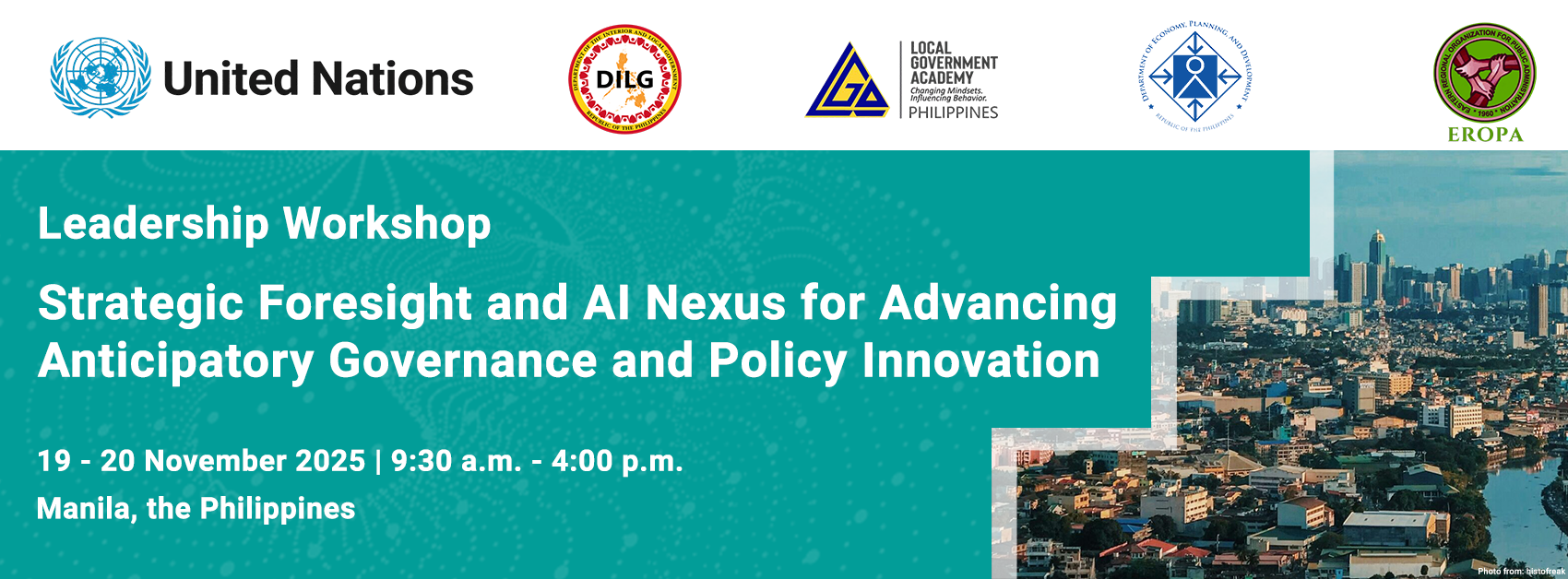 The United Nations Department of Economic and Social Affairs (UN DESA), through its Division for Public Institutions and Digital Government (DPIDG) and its Project Office on Governance (UNPOG), in collaboration with the Department of the Interior and Local Government (DILG) through its Local Government Academy (LGA), the Department of Economy, Planning, and Development (DEPDev), and the Eastern Regional Organization for Public Administration (EROPA), and with the support of the UN Resident Coordinator’s Office in the Philippines, is organizing the Leadership Workshop on Strategic Foresight and AI Nexus for Advancing Anticipatory Governance and Policy Innovation in the Philippines on 29-30 November 2025 in Manila, the Philippines.